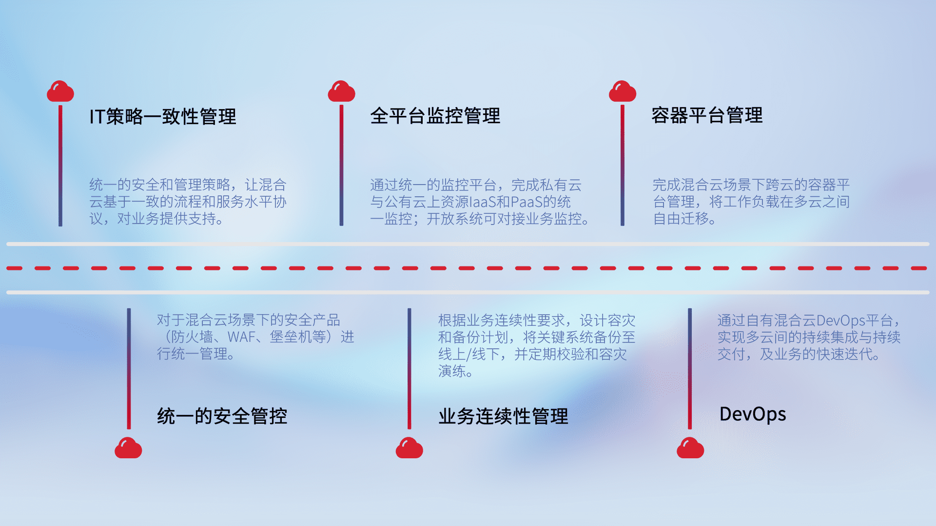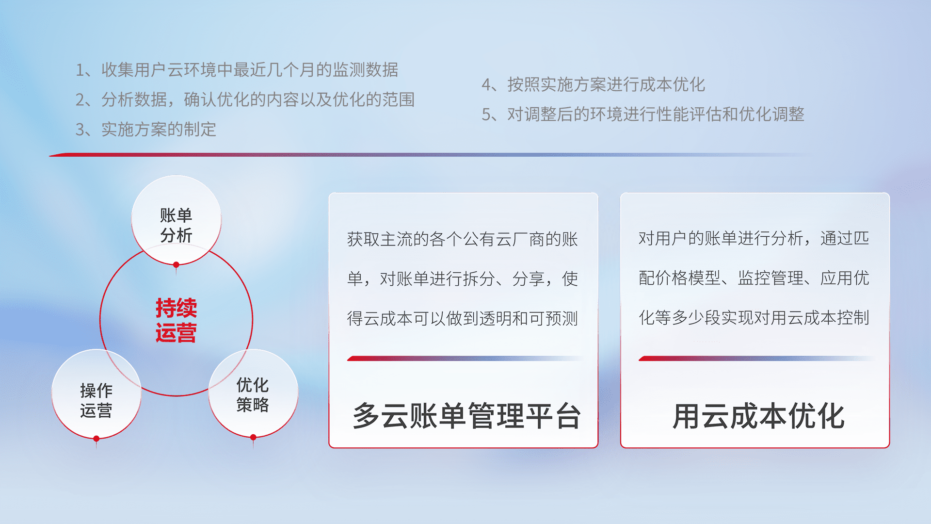 通过多云纳管,,以统一的资源数据模型把客户的云资源进行抽象和封装,,,,进而实现对多云资源的统一操作,,保障云资源管理的可靠性、、、、稳定性与可用性。。。。量身定制化运维内容,,配置、、、、开发运维、、补丁管理、、、备份、、、、监控、、、认证和访问管理、、、、审计和日常巡检等,,,,保障在用云过程中的可靠度,,,,稳定度以及高可用率。。