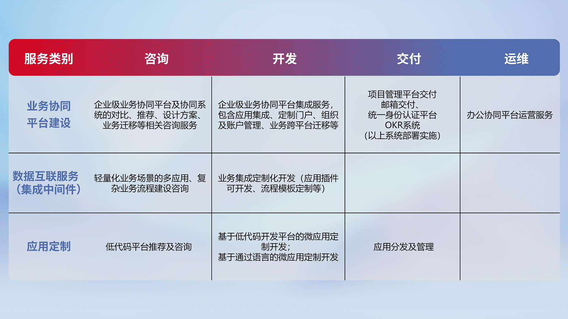 针对钉钉、、、企微、、、IDaas等平台级产品提供产品的规划、、方案、、交付、、、、定制化开发等服务,,,实现如统一协同办公、、、智能客户服务、、混合会议管理、、、、智能数据查询、、等业务场景,,,实现数字化转型。。。。